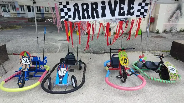 - 4 karts à pédales sont alignés sur la ligne de départ. Un premier groupe de 4 participants s'affrontent sur la piste recrée dans le parc du musée et font la course pour arriver premier. Un autre groupe s'affronte aux manettes du jeu vidéo.