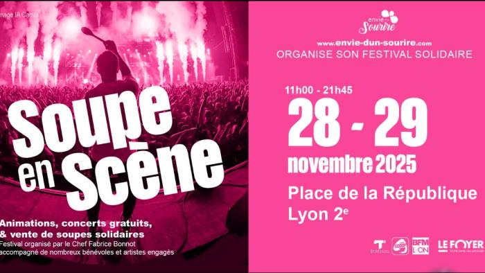 Le festival solidaire Soupe en Scène revient cette année les 28 & 29 novembre, Place de la République à Lyon. Pendant ces deux jours, la place se transformera en un lieu de convivialité et de générosité, fédérant les Lyonnaises et Lyonnais autour d’un plat de saison emblématique : la soupe.