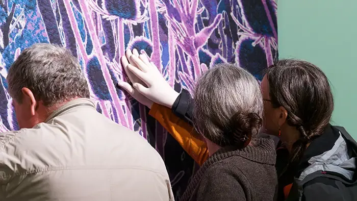 Visite de l’exposition « Echos du passé, promesses du futur – La nature sublimée par le numérique » : le parcours propose de découvrir une sélection d’œuvres grâce à l’écoute, l’audiodescription, le toucher et l’odorat.