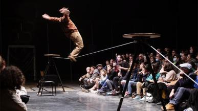 Le fil-de-fériste Arthur Sidoroff accompagné du musicien Thomas Caillou explore la pratique du fil comme matière chorégraphique et sensible.