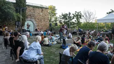 Soirée estivale et festive sur la terrasse du Fort de Vaise, entre ami(e)s ou en famille, explorant l'univers fascinant de l'art de la rue.